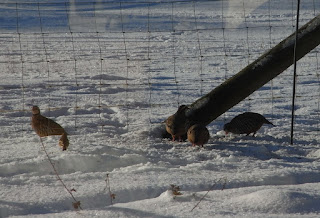 The freezing conditions have brought other visitors into the garden who we haven't seen much of for months. Namely Robins, Blackbirds, a wren and two different partridge families. A family of four pictured here and another, larger family - at least seven, who have been furtling about early in the morning.